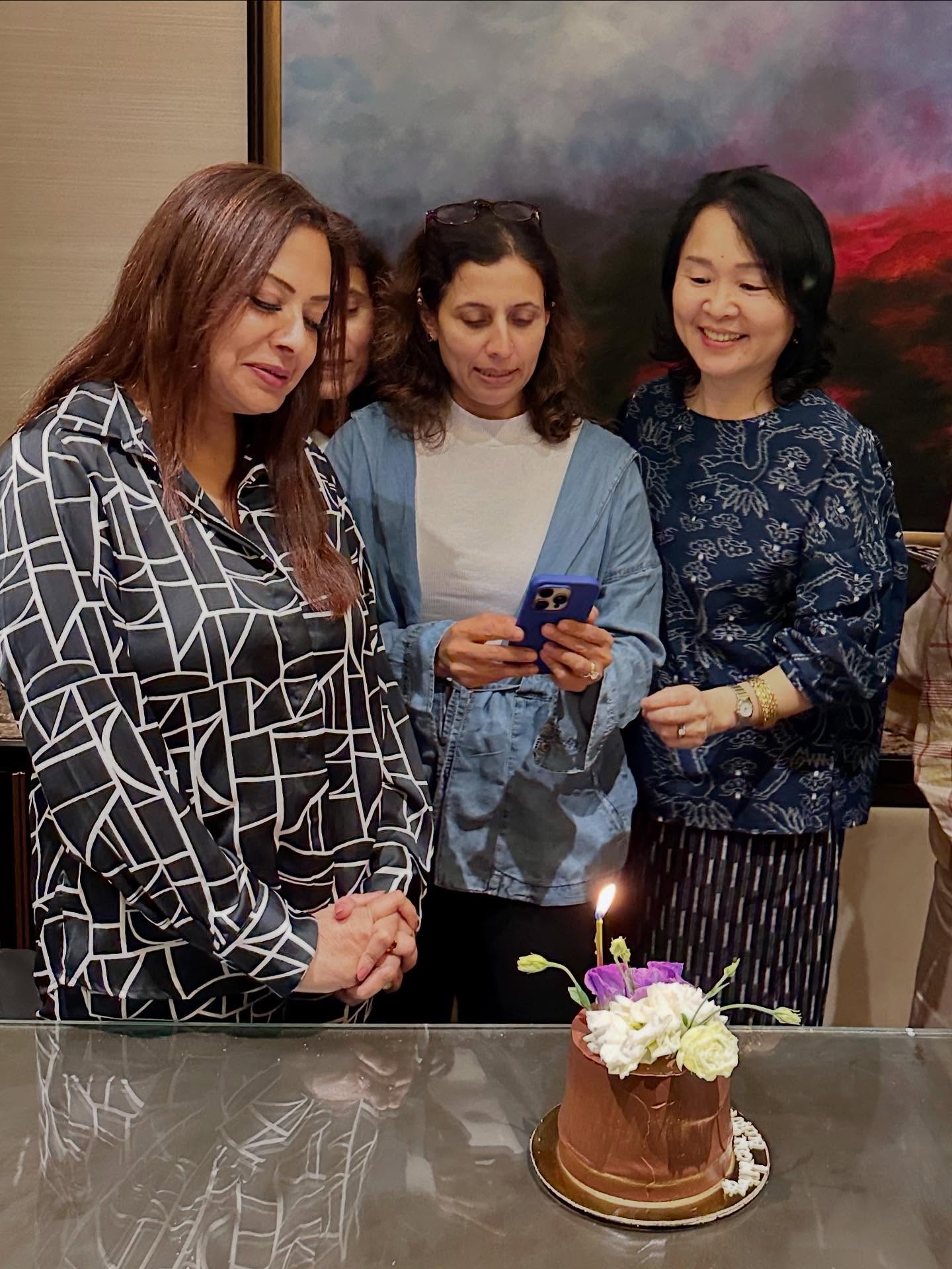 月に一度のミーティングのあと、麗しき我が友の誕生日を祝す。生花に彩られたケーキもまた、美しい。