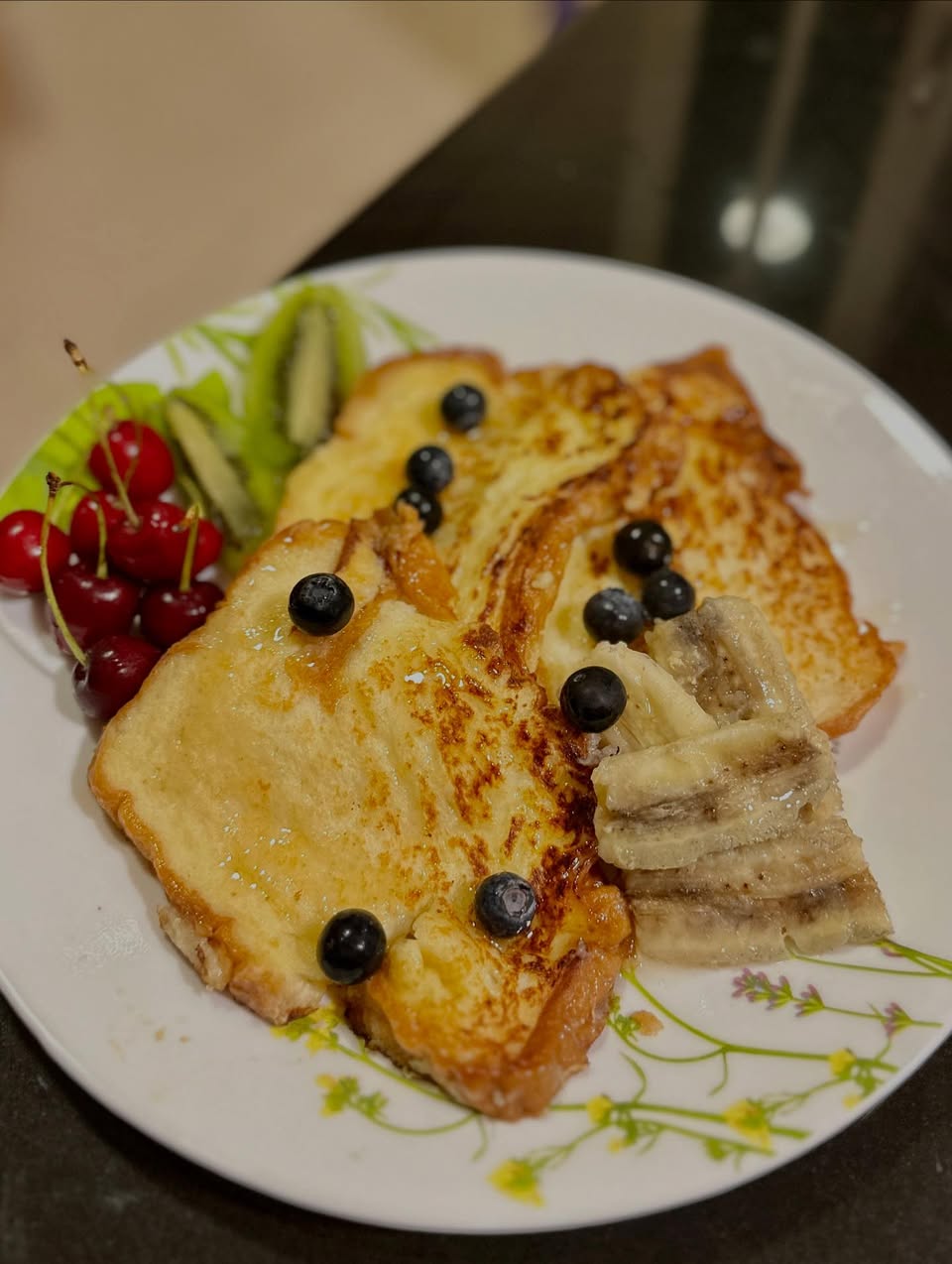 フレンチトーストを焼く。普通のバナナも焼く。蜂蜜をかけて食べる。