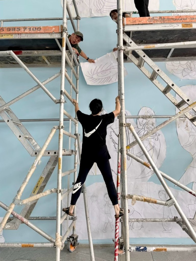 壁に構成を決めるこの作業こそが、壁画作成の肝ゆえ、エネルギーの応酬が発生することは推して知るべし。とはいえあまりの混沌に、最初は途方に暮れる思いだった。しかし、徐々に形になっていく様子を見て、少しずつ、安堵する。