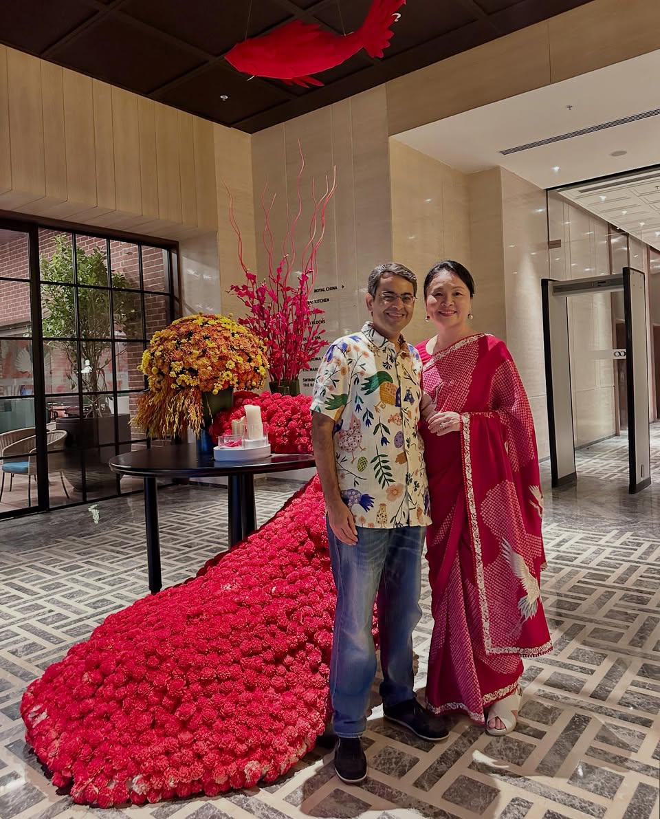 思い返せば今年に入ってまもないころ、自分自身の還暦祝いのために、赤いサリーを購入した。ひとつは京友禅サリーの大きな白い牡丹が描かれたもの。そしてこの、Ashdeenの、パールシー刺繍のサリー。