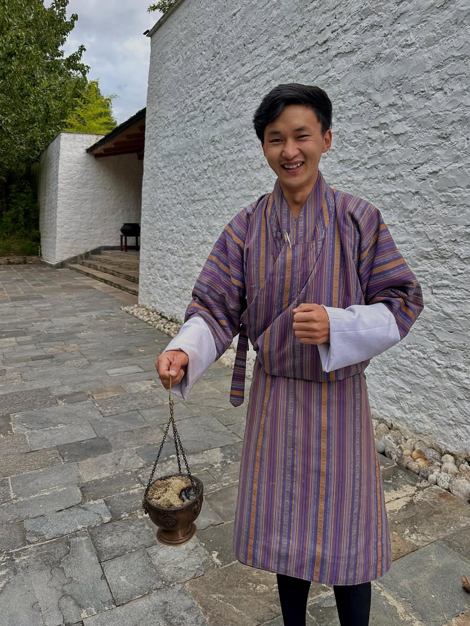 ブータン男性の民族衣裳「ゴ」は、これまでも写真や映像で何度も目にしてきたが、実際に見ると、非常にすてき。かっこいい。日本の着物によく似ていて、ぐっと裾を上に上げ「ケラ」と呼ばれる帯を締めて着る。