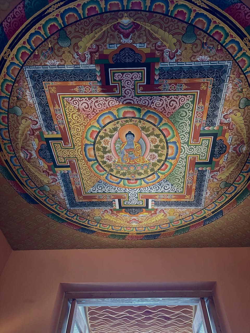 白壁の建築物のドアが開かれると、縦長い光が差し込み、前方に山々と湖を思わせるプールが目に飛び込んでくる。写真では伝えられない、シンプルに、なんとも麗しき情景! 天井には艶やかな曼荼羅が描かれ、来るものを歓迎してくれる。