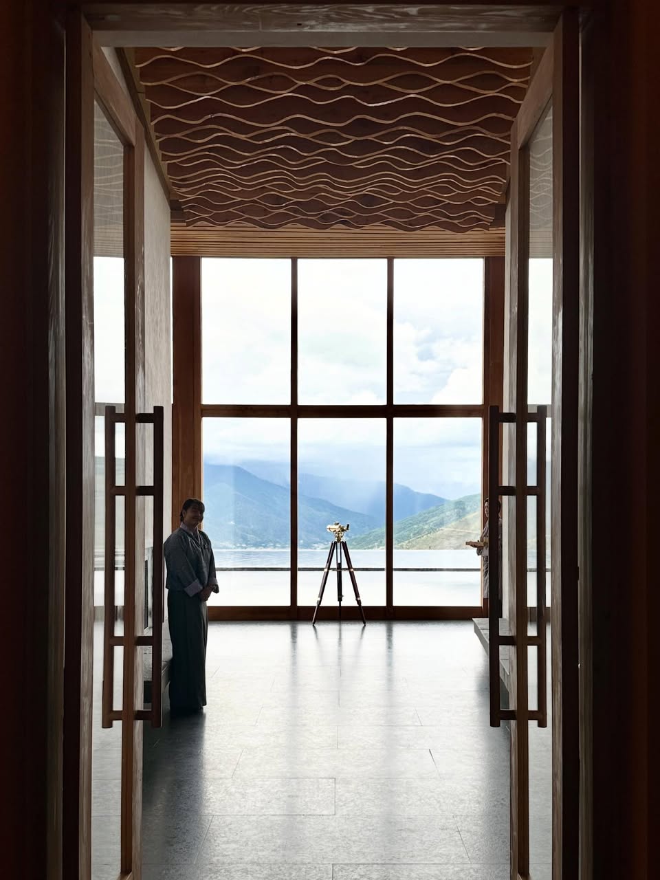 石と樹木がふんだんに使われた内装は、わたしの好みにぴったりで、ただただ、うれしい。彼方に見えるは黄金色の巨大な仏像、「ブッダ・ドーデンマ(Buddha Dordenma)」。なんという絶景。
