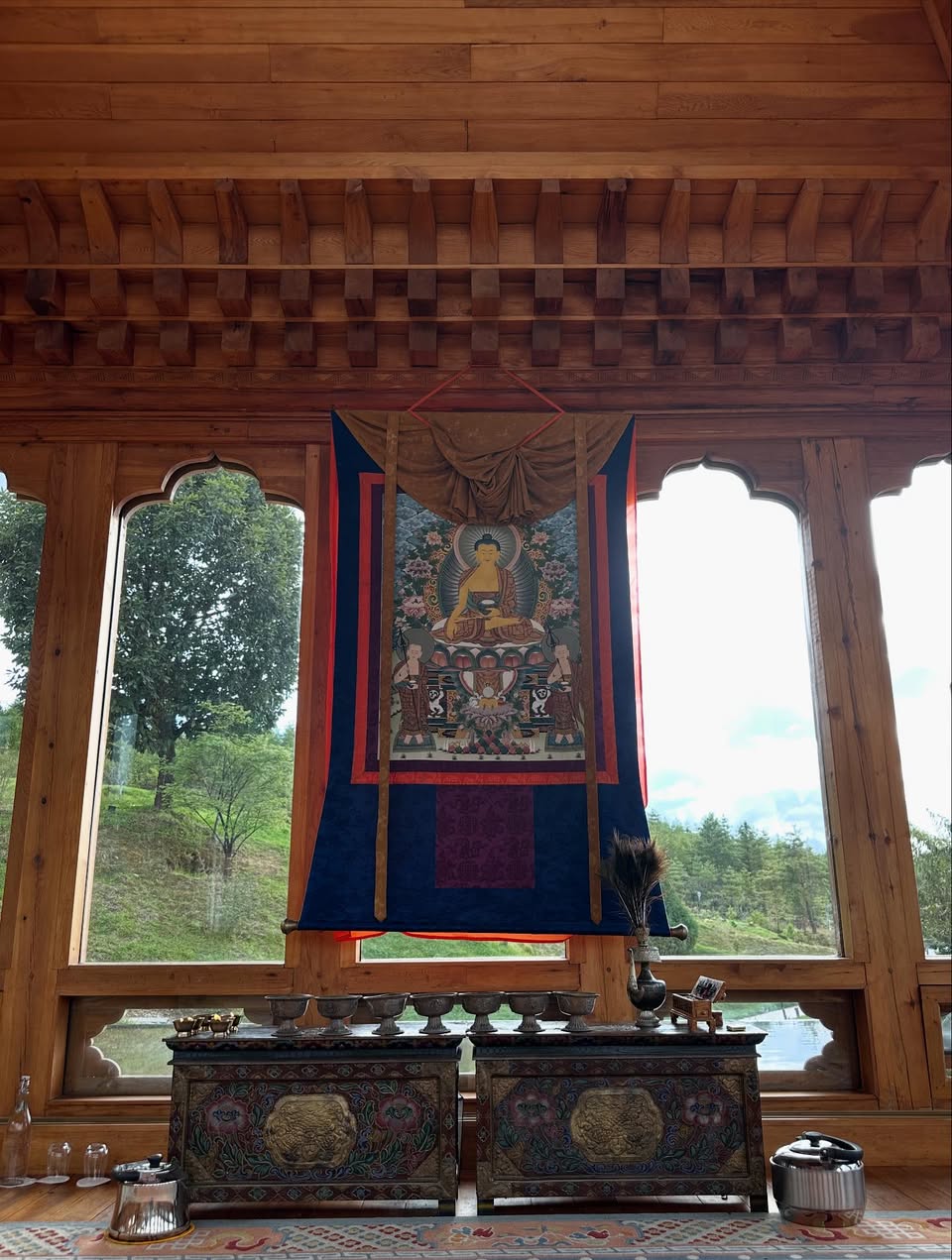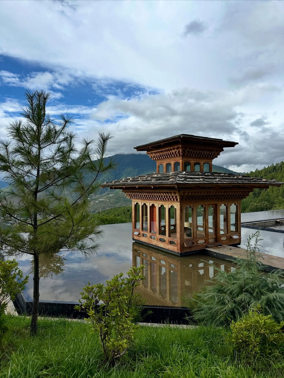 首都ティンプーでの豊かな1日は過ぎて、夕暮れどき、リゾートに戻る。青空と白雲、濃き緑が目にも鮮やかで、曇天だった初日の印象とは全く異なる情景が広がる。