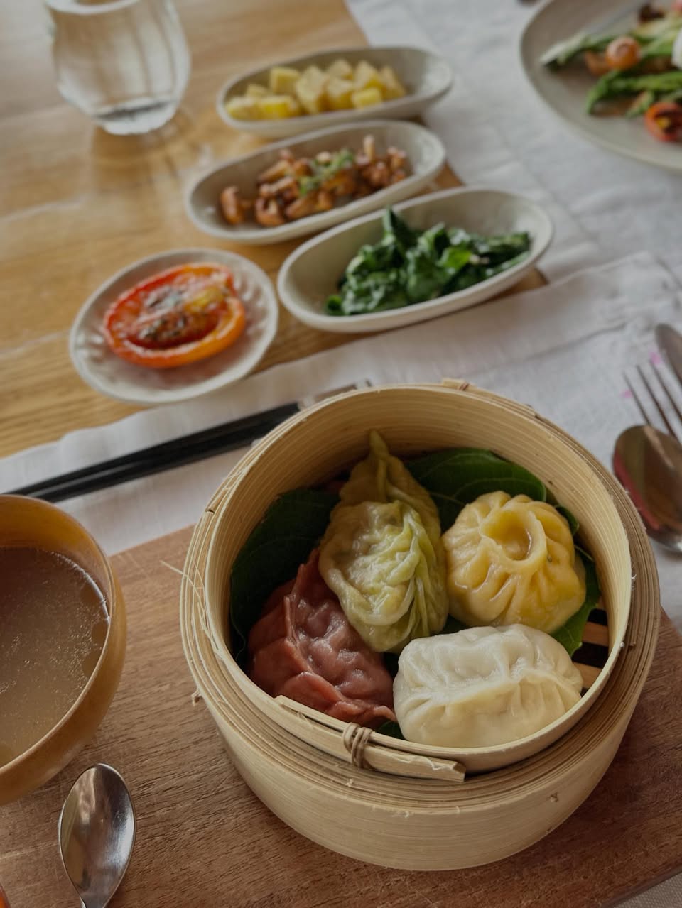 メニューを見ながら悩んだ末に、「4種類のモモ」のセットを注文した。野菜、豚、鶏、牛……と、インドの飲食店では、ほぼあり得ない組み合わせの4種類だ。夫はエッグ・ベネディクト。こちらもとてもおいしそうだ。