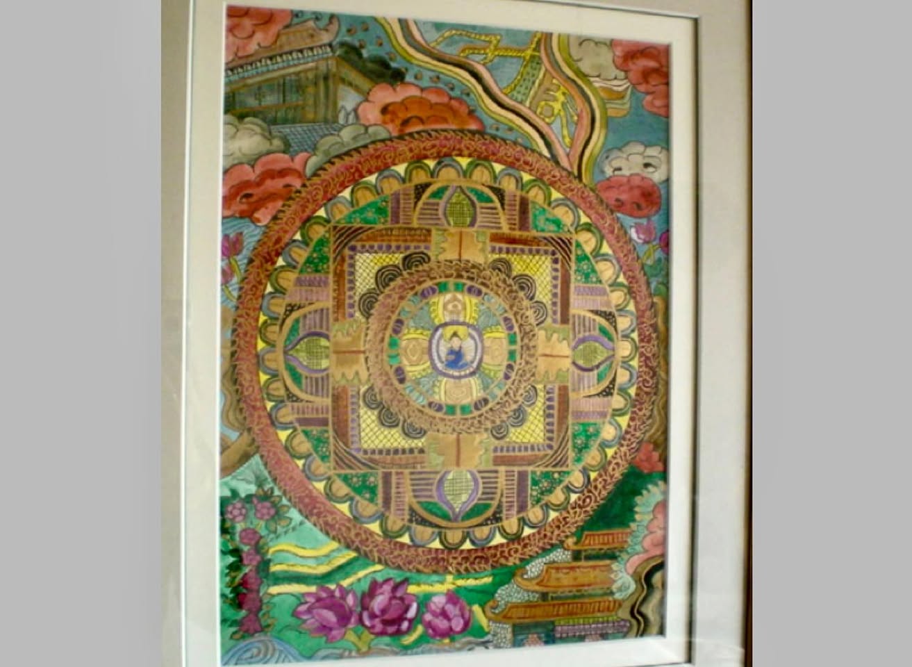 大学の寮から帰省し、実家で過ごしていたある日。実家に掛かっていた曼荼羅の絵をしみじみ眺め、自分も描いてみたくなった。部屋にあった高校時代の絵の具や筆、画用紙を使い、アルバイトの合間を縫って、わずか数日で2枚描いた。