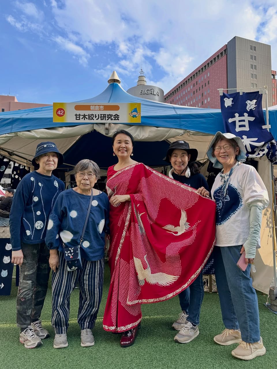 柳川名産のい草のティーマットを買ったり、回転焼きを食べ歩きして楽しんでいたところ、「甘木絞り研究会」のお姉様方に声をかけられる。そう。わたしのサリーも本場インドのバンダーニ(絞り染め)が施されているがゆえ。