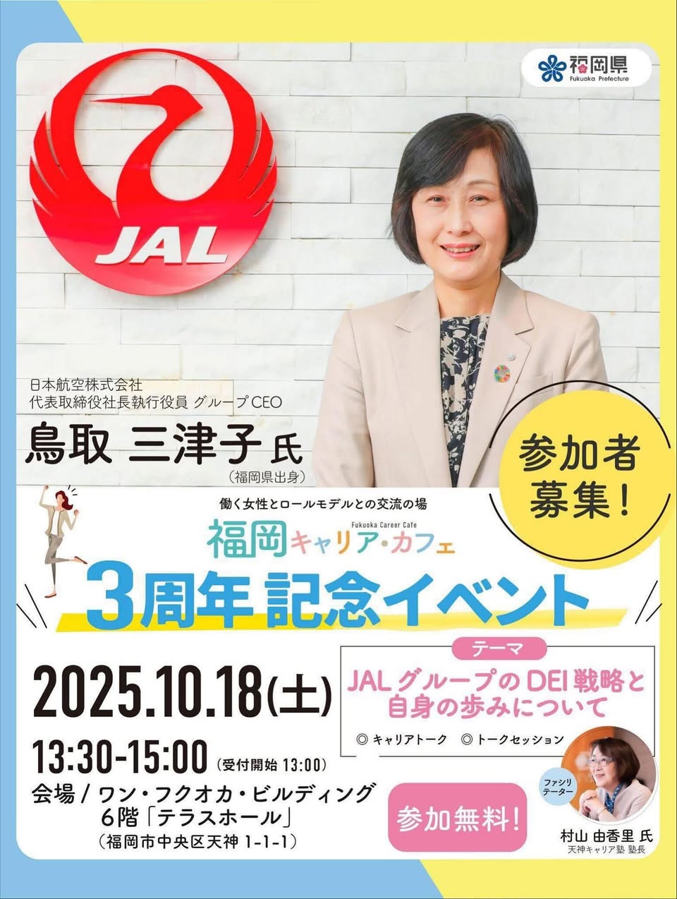 福岡にいながらにして、起伏に富んだ日々を過ごしたこの1カ月足らず。10月18日は、「福岡キャリア・カフェ」が3周年記念として主催していた鳥取三津子氏(日本航空株式会社代表取締役社長執行役員 グループCEO)の講演に赴いた。