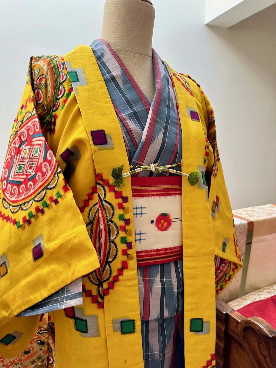 今回は、シンプルなリネンのドレスと合わせたが、このストールが主役となり華やかな印象になった。黒や白のパンツやトップとも合わせられるから旅行にも好適だ。ベルトでウエストを締めるのもいいかもしれない。