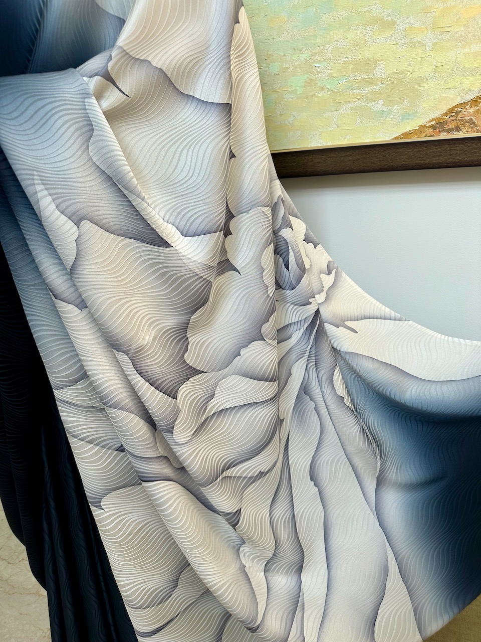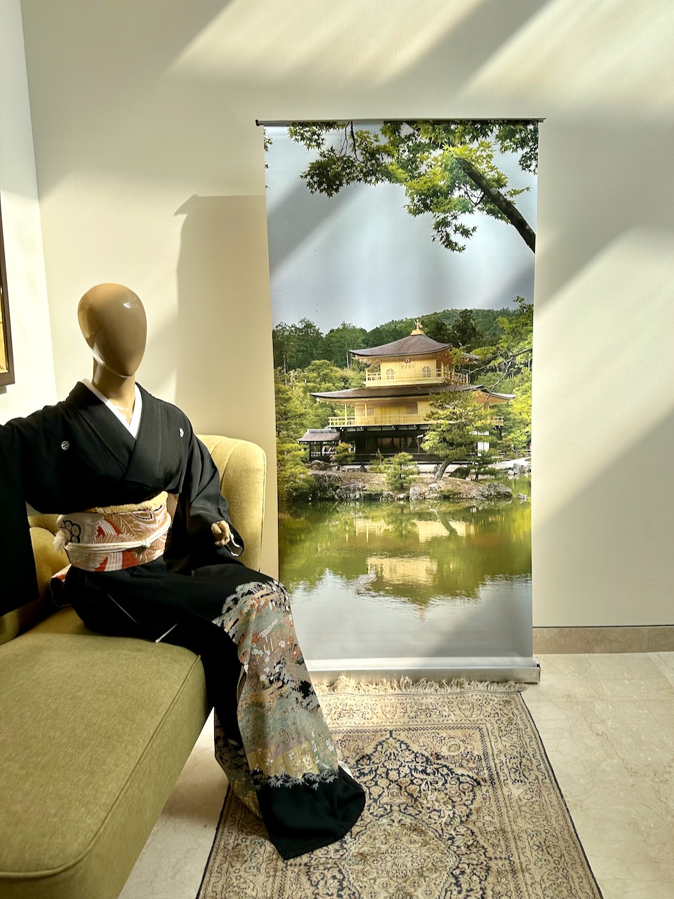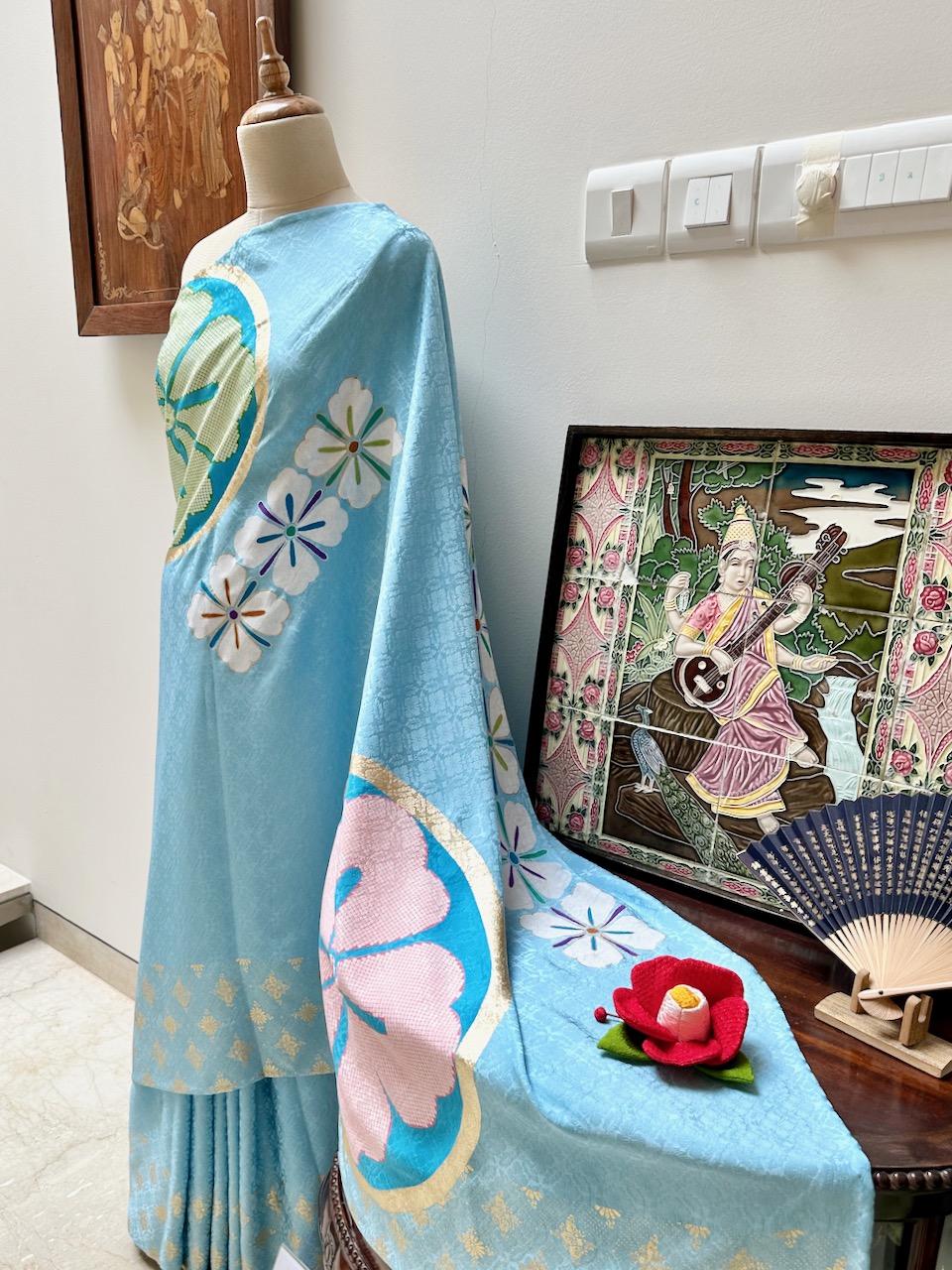 京友禅サリーには、丹後縮緬と呼ばれる正絹が用いられている。しっとりと滑らかで光沢があり、適度な重みが優麗なドレープを生む。