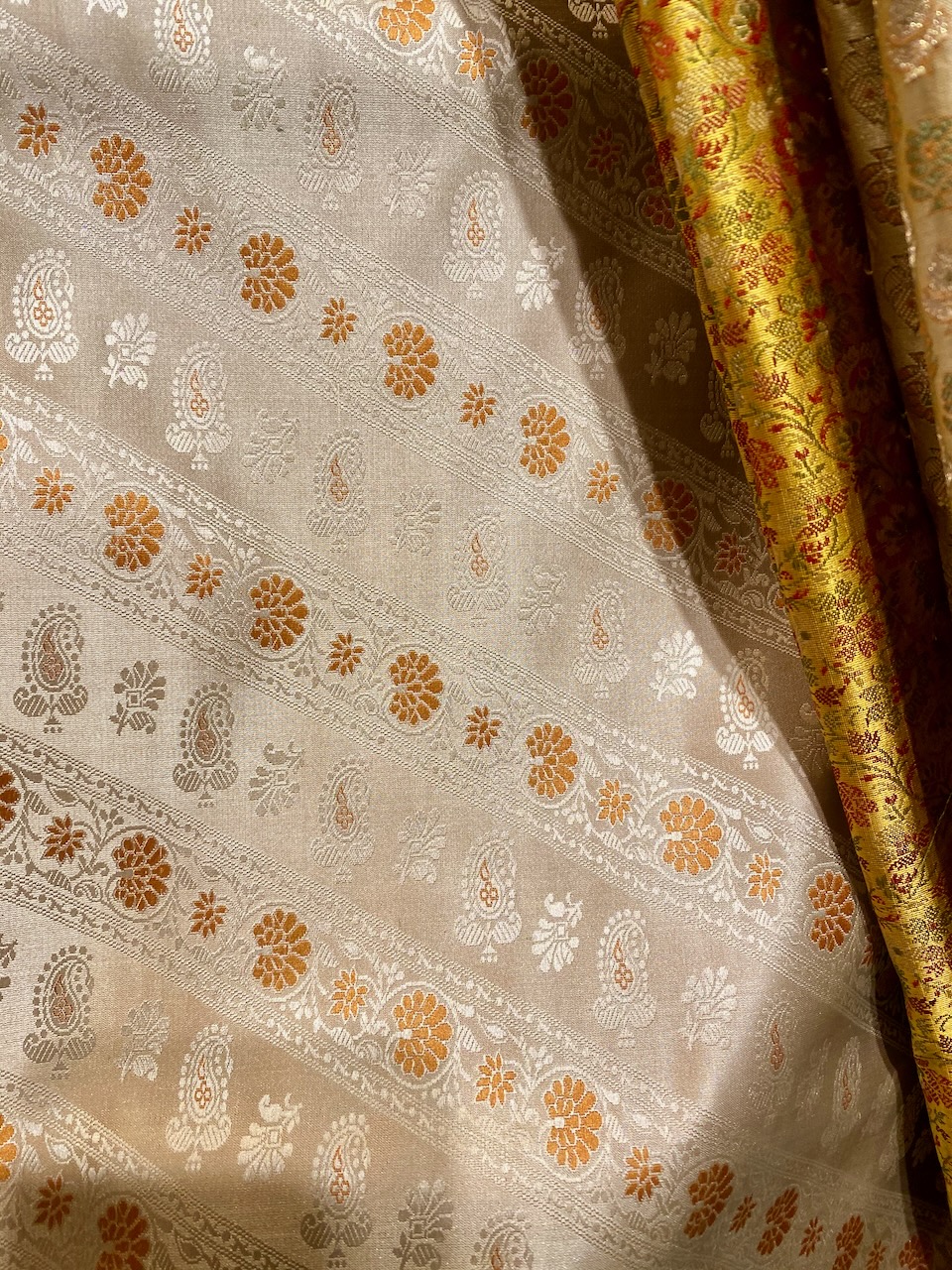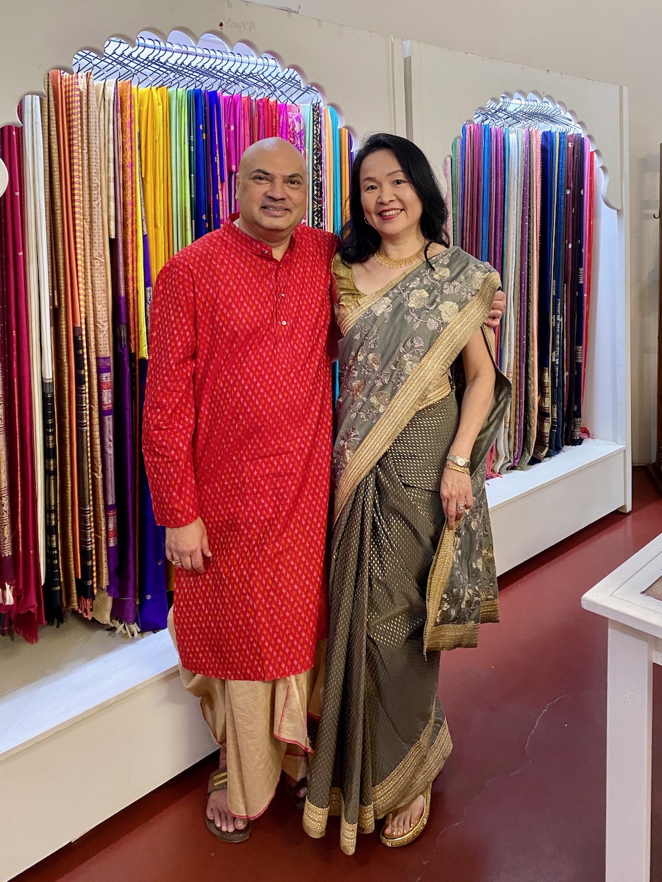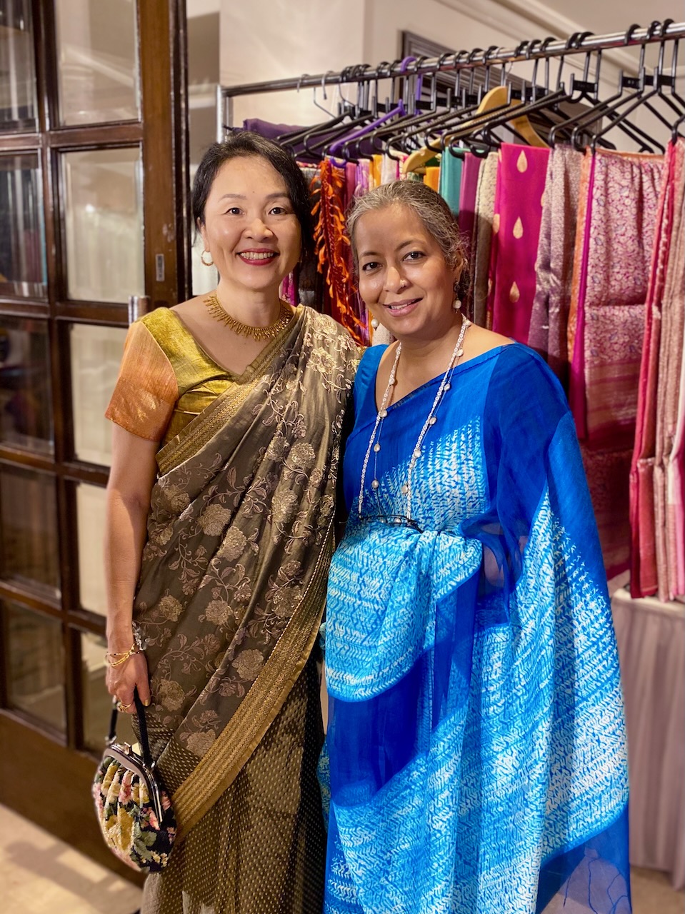 🇯🇵1枚目の写真。Ashdeenが持っているのは京友禅サリー。わたしが持っているのは「KYOTO」と名付けられたAshdeenのサリー。