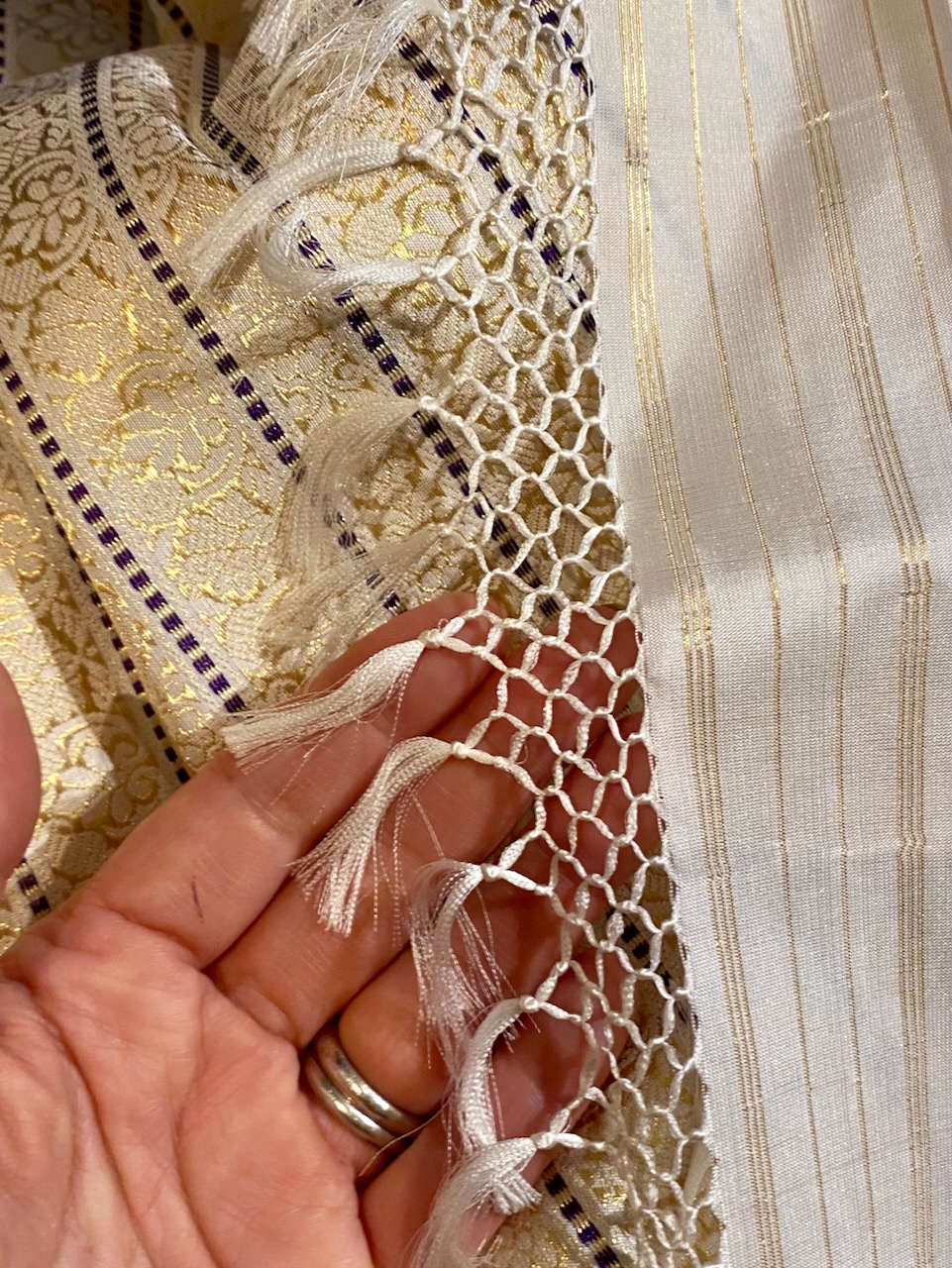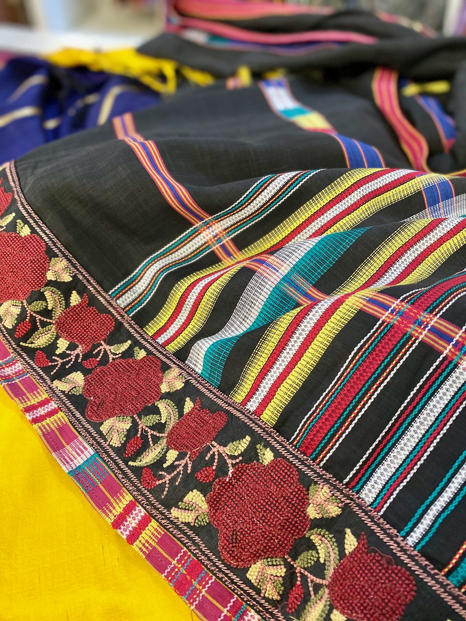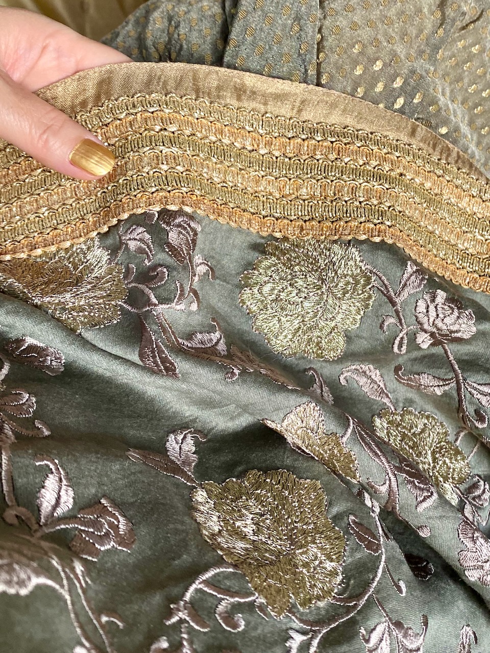 サリーの「アップサイクル」とも銘されたこの「A Touch of Joy」の取り組みは、個人的にも非常に関心がある。早速、彼のサイトを検索し、作品の数々を見る。いずれも「懐かしさ」を感じさせる気品が漂う。中でも真っ先に目に止まったサリー。これがいいな……と思いつつ、展示会の前日、Ambaraに立ち寄ったところ……。あった!